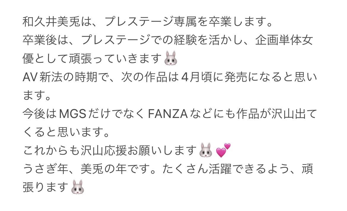 这大概可以解释為什麼在1月的「ひたすら生でハメまくる、终らない中出し性交。」后,和久井美兎2月没有在蚊香社发片的原因,而她也在twitter上说因為AV新法的缘故,她的新片要到4月才会上市,届时大家就可以在FANZA看到她精彩的演出了(因為Presitge的作品在FANZA只有通贩,串流看不到):
