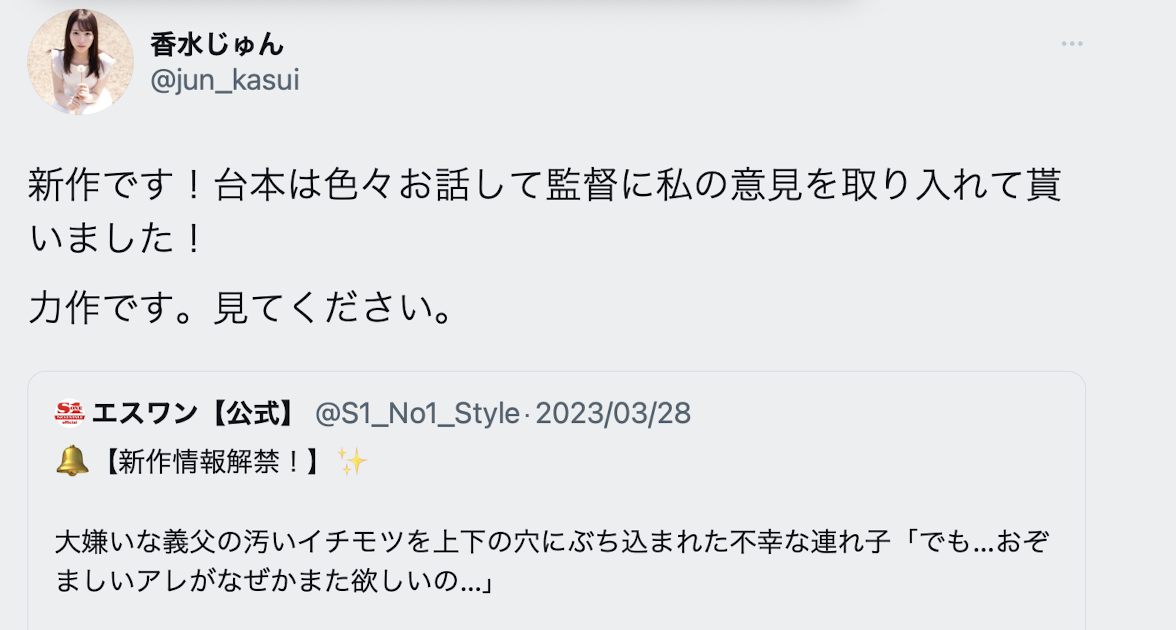 她说自己是真心想让这支作品好看,所以非常认真地想把每一个细节做好,这么好的女孩值得现场为她加油ー是的,容我做个宣传,今天(4/28),晚上的九点钟,ForAVer就要进行香水じゅん(香水纯)首次海外活动、也就是台湾摄影会的报名,我们将会在5月12日到14日举办2场棚闪(5/12)以及5场团体(5/13-14)共七场摄影会的活动,以香水じゅん(香水纯)的外型和知名度,名额势必秒杀〜