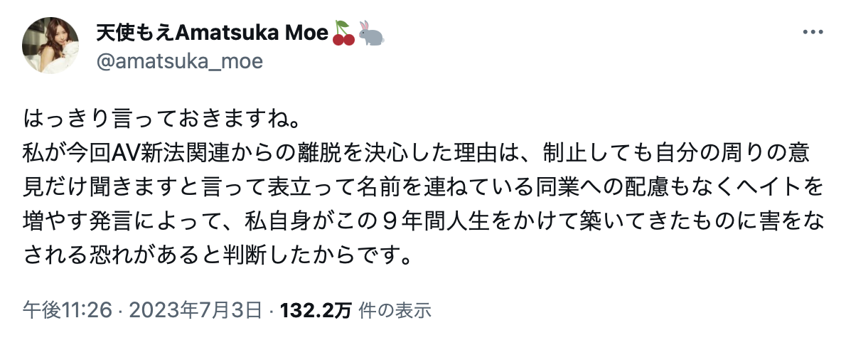 或许在那一刻天使就决定要远离新法战场了吧?只是和过去的战友切割当然也有些副作用,有些人不解为何天使说变就变有些人则是不满,于是天使的社群马上炎上战翻天,连同人AV这种非日本法律保障的业者都开一堆分身来战,也才有所属事务所BStar官推公告再有毁谤中伤就要提告了⋯