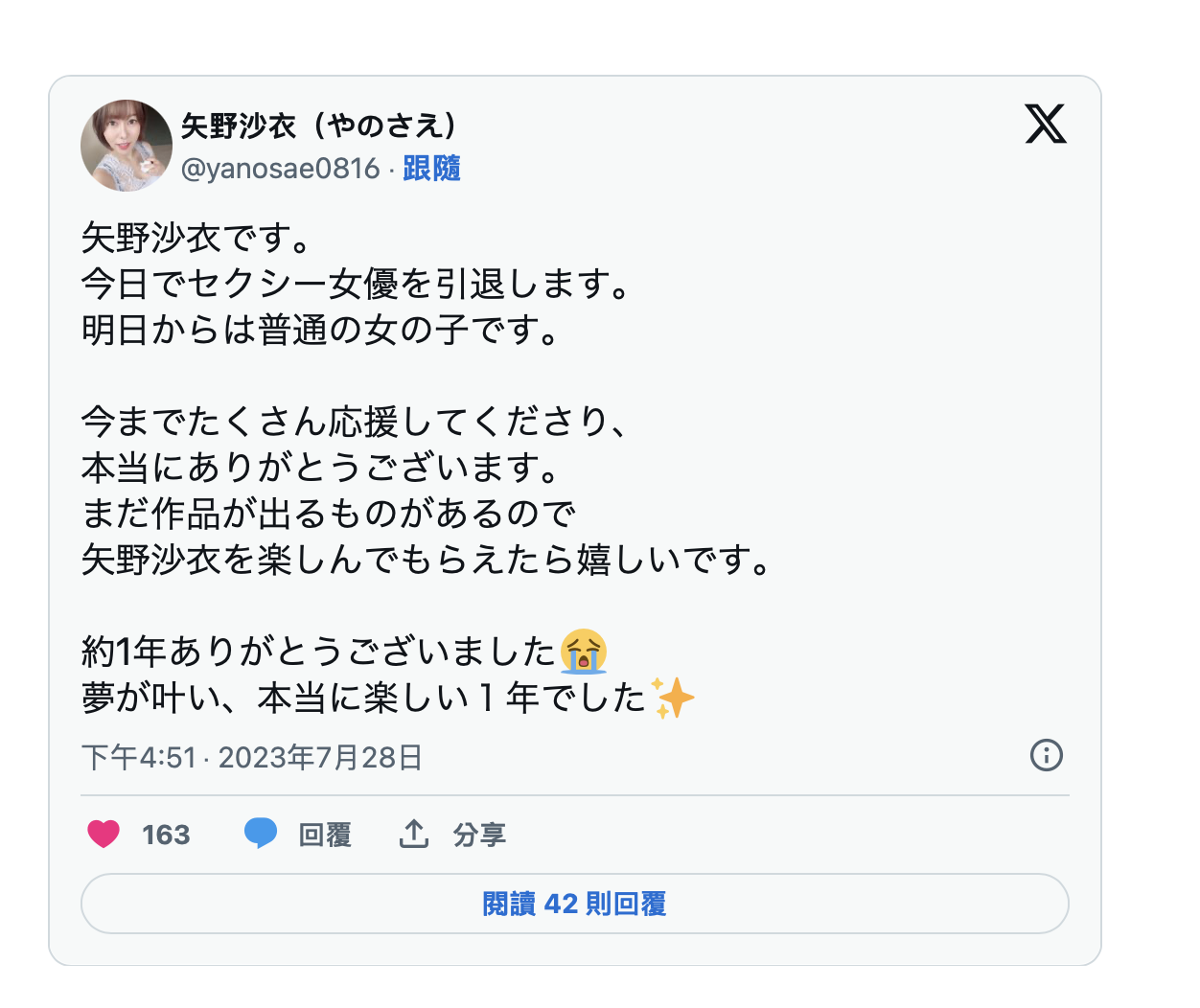 好快,一年过去了,好快,矢野沙衣宣布引退了。