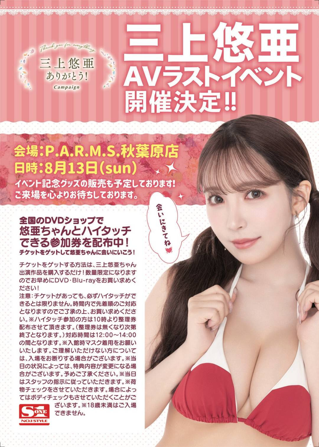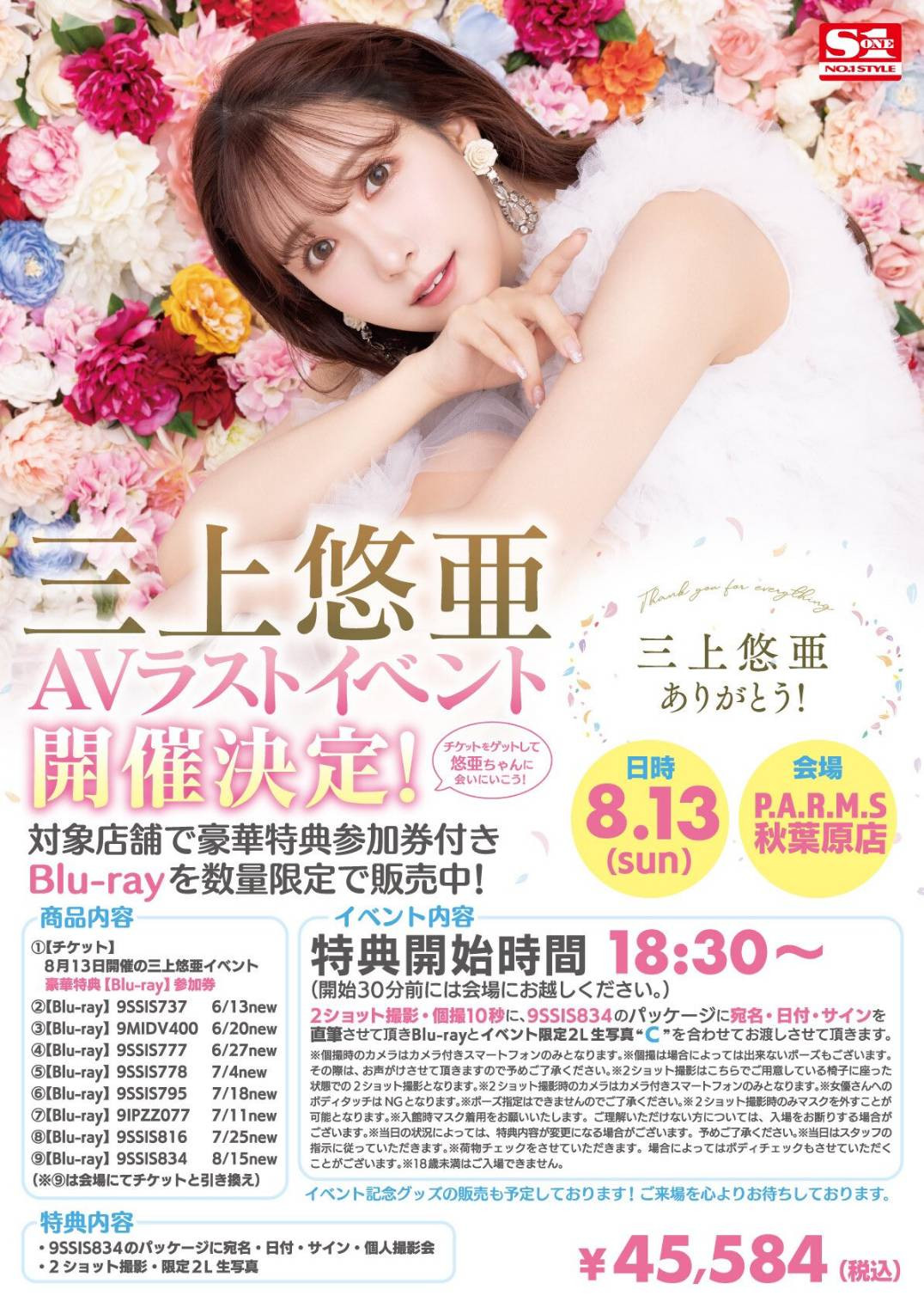 除了参加券之外还强迫购买SSIS-737、MIDV-400、SSIS-777以及SSIS-778四支作品,摄影会不得录影,结束后可以和三上击掌,最后还可以拿到活动限定生写真「A」,售价18,392日币(约台币4,100元)。