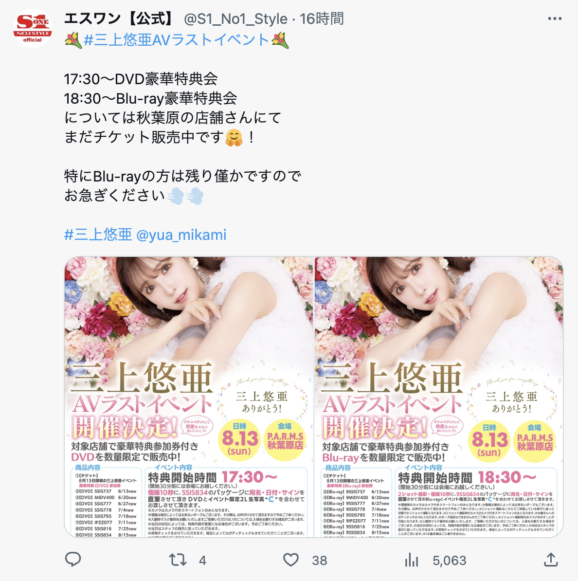 为什么?可能是门票太贵、可能是福利太少太短也有可能是目前三上主力客群的女粉对这样的活动不感兴趣,但不管怎样这样对三上来说绝对是很没面子的事;不过大家也不用高兴(或感慨)得太早,接下来的16日还有一个她自己举办的活动,到时我们就知道三上是真的退烧了还是大家觉得引退见面会CP值太低不值得去改去参加她自办的引退趴踢ー