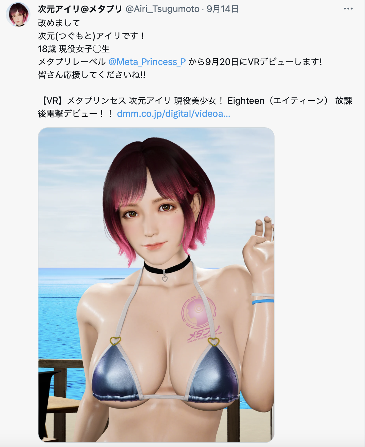 我觉得答案是肯定的,因为成人影片市场本来就不限于真人演出的AV,要看的只是AI这一块能抢走多少市场;而随著作画技术的成熟以及现在Vtuber流行,日本现在也出现了一家新厂商「メタプリ」有了这么一支作品「【VR】メタプリンセス次元アイリ现役美少女! Eighteen(エイティーン) 放课后电撃デビュー!! 」: