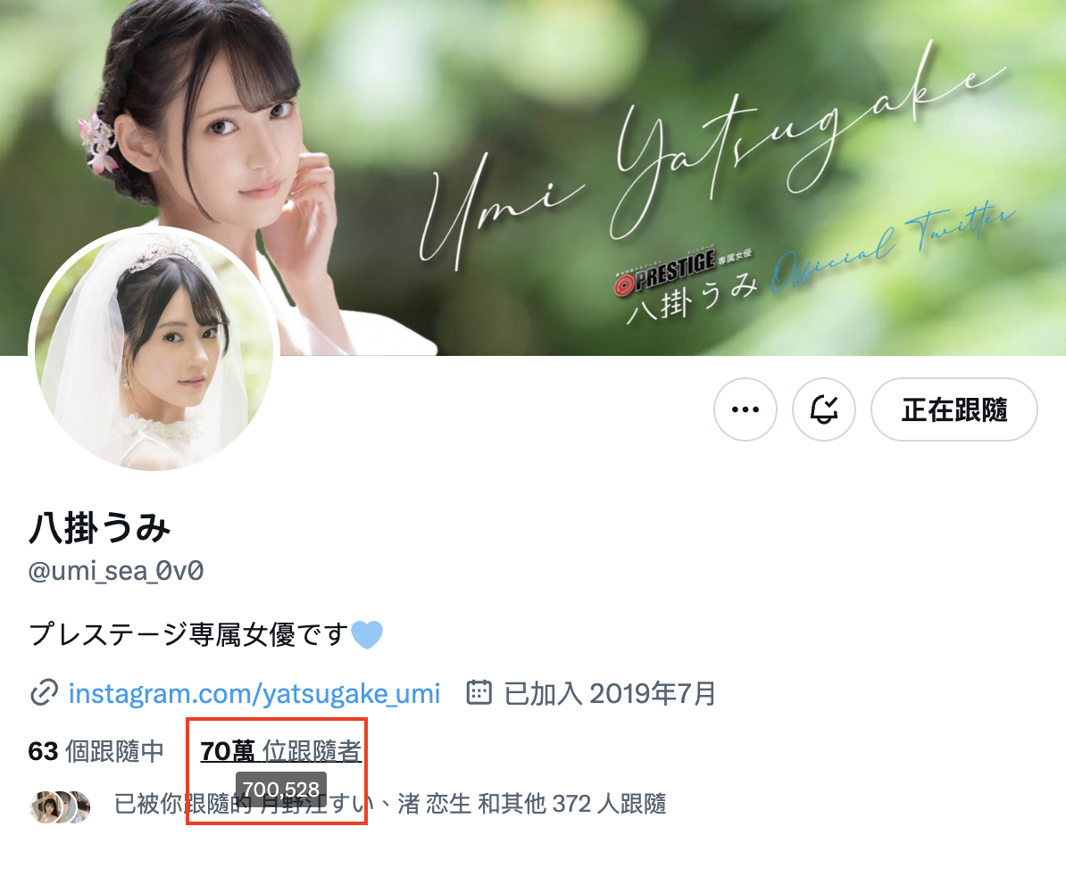 看到凉森れむ(凉森玲梦)的X(twitter)突破百万大关,相信很多朋友也注意到了,与她一样在蚊香社打拼,人气也非常旺然后也来到台湾参加TRE台北国际成人展的「八挂うみ(八挂海)」不久前X(twitter)也突破70万追踪,厉害非常非常厉害〜