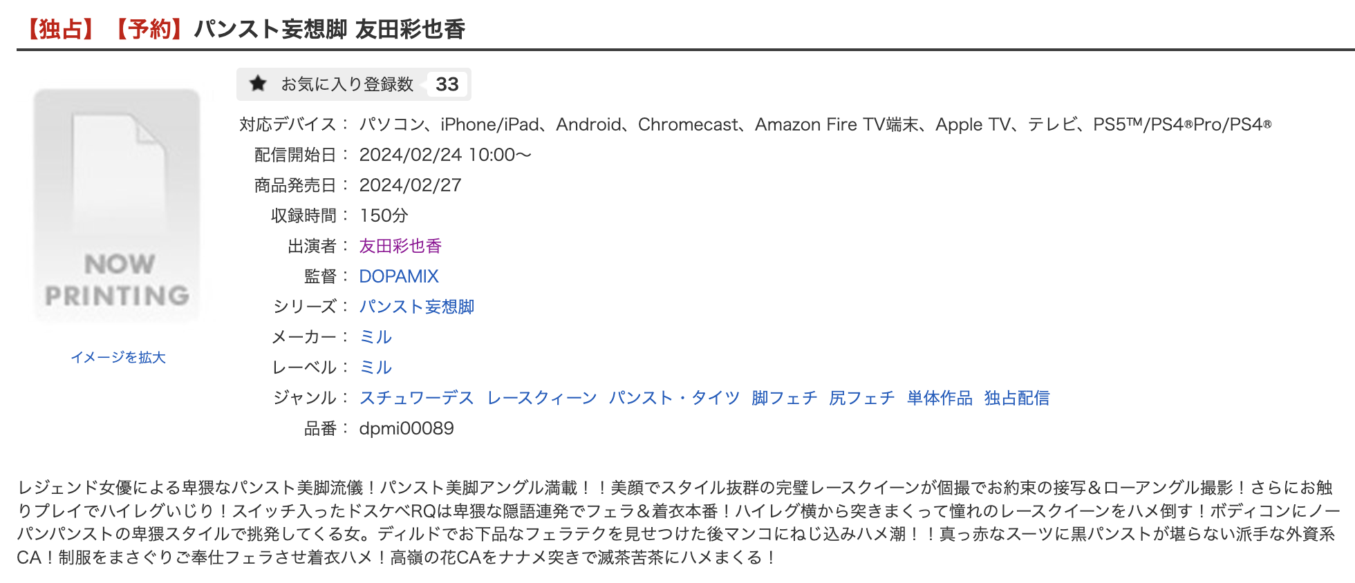 对的,没有片商接手,所以友田彩也香要重回企划女优的位置了,证据就是这支在FANZA串流平台发售的作品「パンスト妄想脚」;往好的地方想是友田又可以像2010年那样拼命发片让大家看到各式各样还有高画质摄影的她,而友田本人也已经承诺会有很多作品和大家见面;我是蛮期待的,虽然现在没有AKB48可以模仿、她年纪和外型似乎也只能去演人妻系的企划,但我始终相信友田的斗志,她不会认输的,也希望Diaz Group可以好好帮她找工作〜