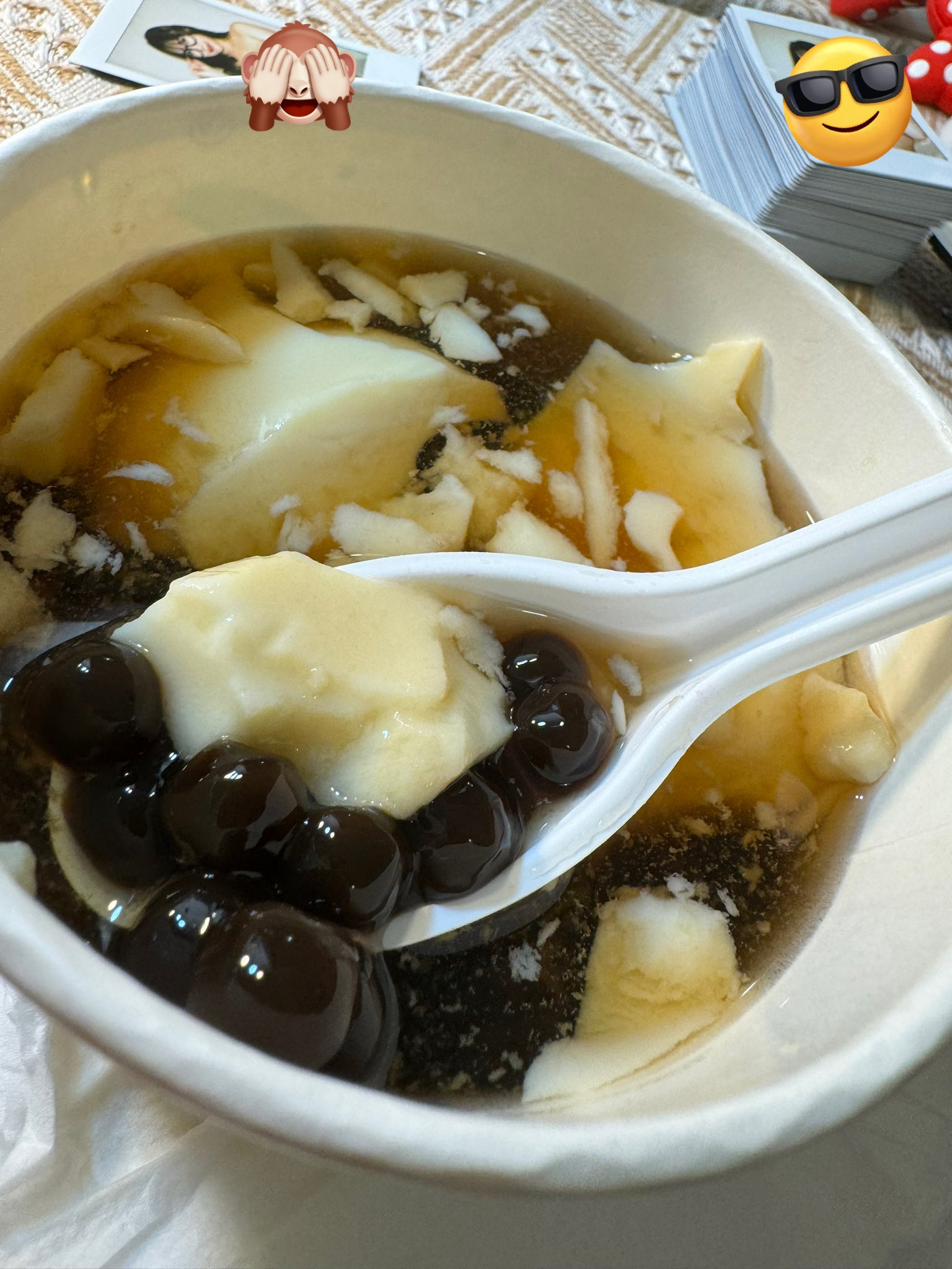 这要求很不日本人,最近活动很多,我们都是挖空心思招待这些来自己日本的客人,而「甜点」一直是我们的重点项目,每次举办摄影会我都会列出5~6种菜单供她们挑选,其中反应最好的就是杏仁豆腐和雪花冰,而豆花则是反应最一般甚至有人会吃一口就不敢吃了,想不到除了本庄铃,还有人喜欢豆花: