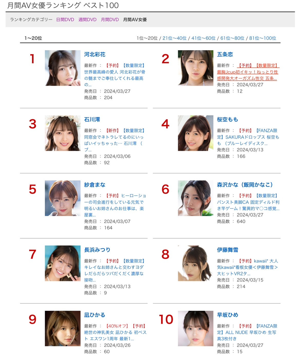 最后就是要来看累积的销售排行,河北彩花仍然是金枪不倒的天下第一人,第二名的位置则是被在TSE大放异彩的J罩杯战将「五条恋」,还记得我之前说她有一支作品打进前十名吗?那是写真作品,加上AV作品第17名就把她推上总销售量的第2名⋯