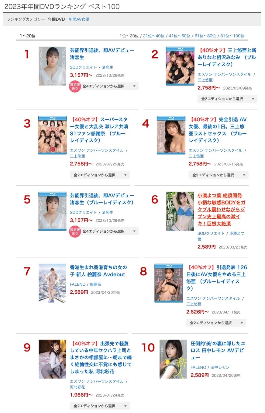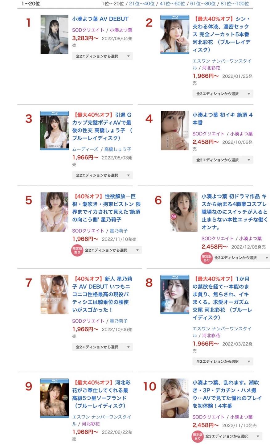翻开近两年FANZA实体DVD的排行榜,我觉得这卖家在唬烂:去年(2023),因为三上悠亜引退、艺能人渚恋生(渚恋生)以及香港女优絵丽奈出道再加上田中レモン(田中柠檬)复活让通贩排行榜的前十名都是怪物,时至今日除了三上都没有引退,要这些人暪着事务所下马赚无码卖家了不起20万日币(41000台币)的片酬是不可能的;再往前一年(2022),除了高桥しょう子(高桥圣子)引退之外,排行榜几乎都被河北彩花、小凑よつ叶(小凑四叶)以及星乃莉子包办,还是同样那句话,这些人现在都很活跃,不需要去赚无码卖家的〜