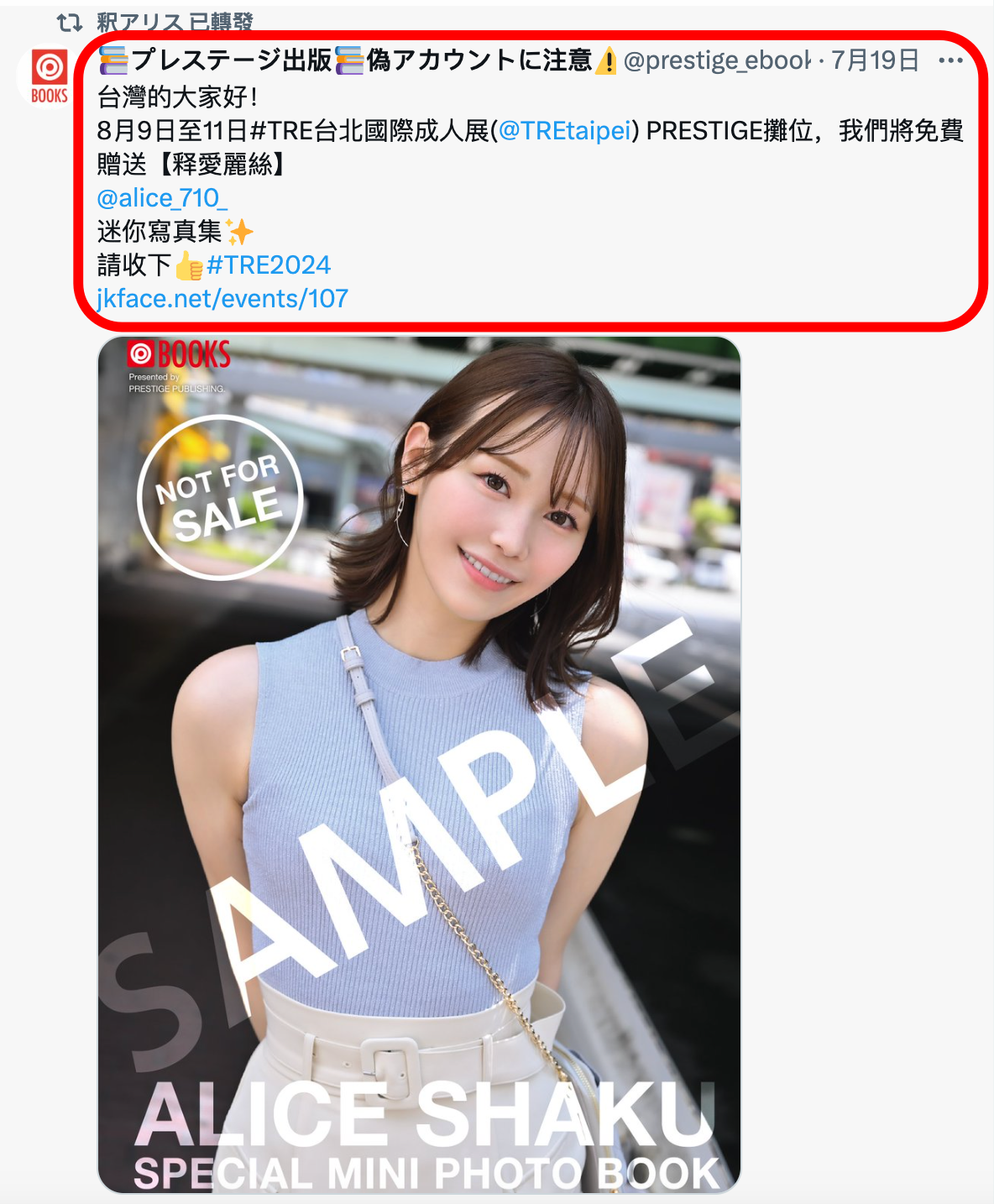 有在关注TRE台北国际成人展的朋友,应该都注意到Presitge摊位有位名叫「釈アリス(释爱丽丝)」的姑娘吧?