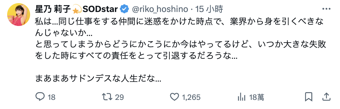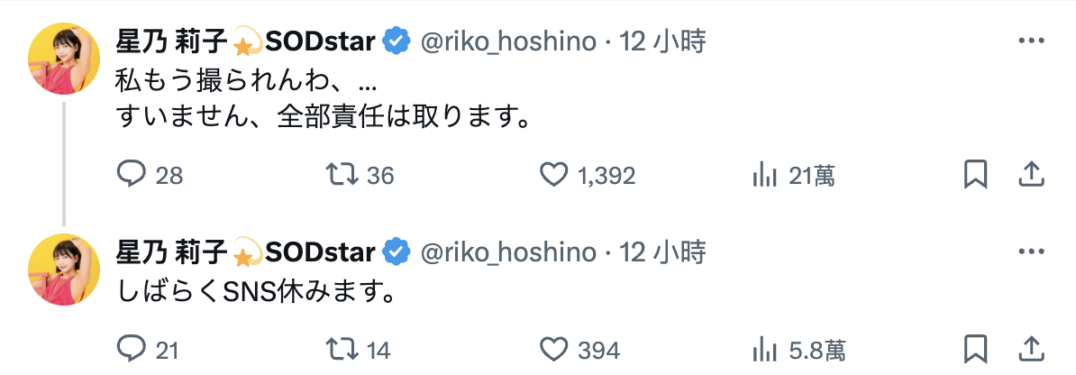 从这两段发言就知道星乃莉子应该暂时没办法拍片了,至于承担什么责任呢?我想应该就是影响片商SOD STAR的工作进度以及拍片喊卡所造成的损失ー那为什么要暂离社群呢?这边让我讲个小故事,之前的TRE台北国际成人展曾经有一些女优临时缺阵突然辞退活动对吧?他们的担当经纪人多半也都选择不来台湾以完全消失做为道歉的方式,意思大概就是「闭门思过」吧: