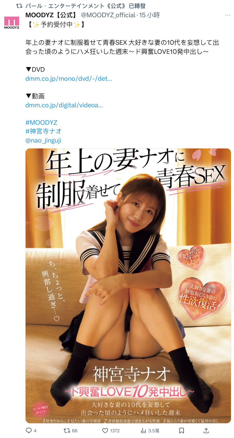 一般来说要看女优隶属那间事务所,看她们X追踪谁就有答案,但这点偏偏不适用于神宫寺ナオ(神宫寺奈绪),她只追Moodyz和Madonna两间片商,另外一个办法就是看哪一间事务所转发神宫寺ナオ(神宫寺奈绪)的社群发文,这时候你就会发现有一家新的事务所「パール・エンターテインメント」(Pearl Entertainment,X为https://x.com/pearl_recruit):