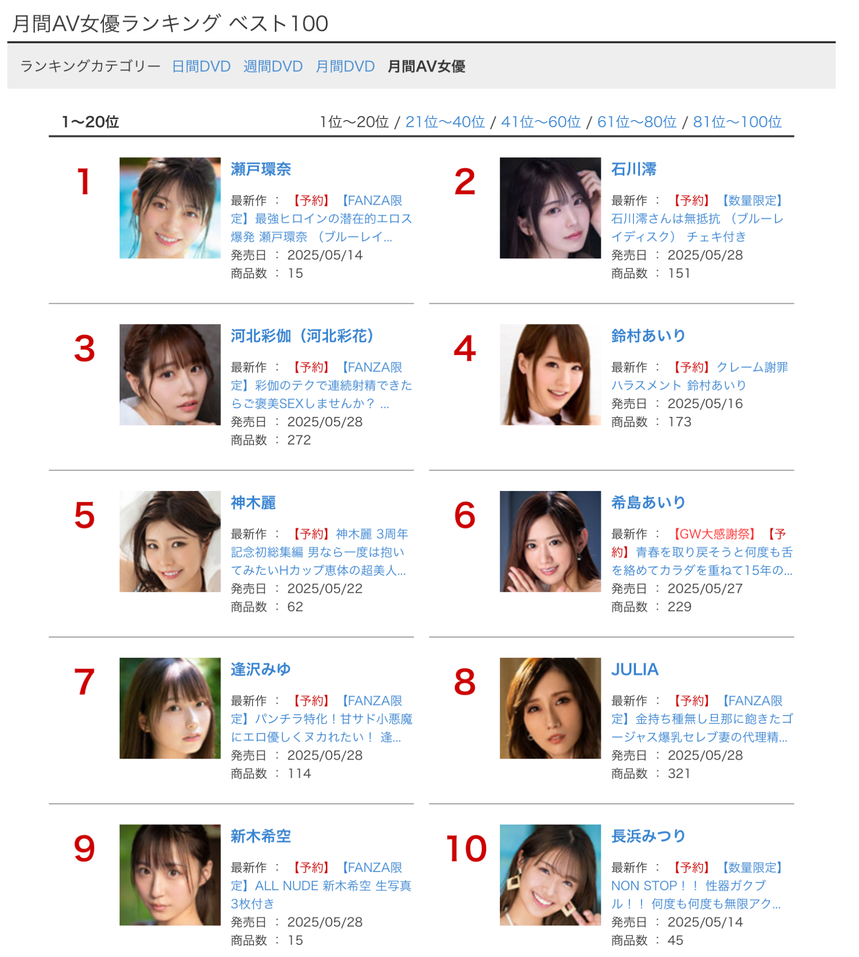 瀬戸环奈又更上一层了,除了照样拿下通贩排行榜第一(最强ヒロインの潜在的エロス爆発)之外,也是实体片累积销售的月间AV女优排行榜第一,而在串流平台的动画榜她更恐怖,「最强ヒロインAV初体験3本番」拿下第一,然后第二第三也是她,起来加在串流平台累积销售成绩的月间AV女优排行榜现在也是她第一,过去在这个排行榜上遥遥领先的发片机器们如「美园和花」、「松本いちか(松本一香)」以及「弥生みづき(生美月)」都不是她的对手,很难想像瀬戸环奈才是个1月出道、总共只有4支AV作品的新人……