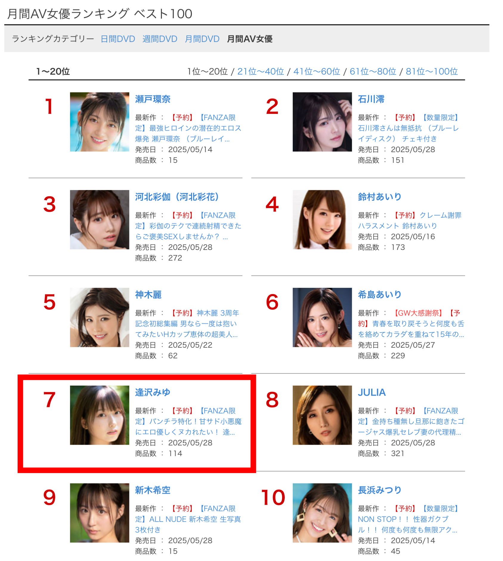最后看累计销量排名的月间AV女优排行榜,音乐家是前10名只有一位策划女优进榜,那就是「逢沢みゆ(逢泽美优)」,其实她确实做了正确的选择,然后继续当专属女优销售不振,不如成为企划女优疯狂发片乱棒打死老和尚,她完全没有适应期,不只是在FANZA这个平台销售强滚,作品在各个卖实体片的店铺也都卖得吓哭: