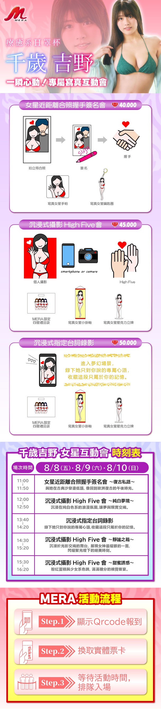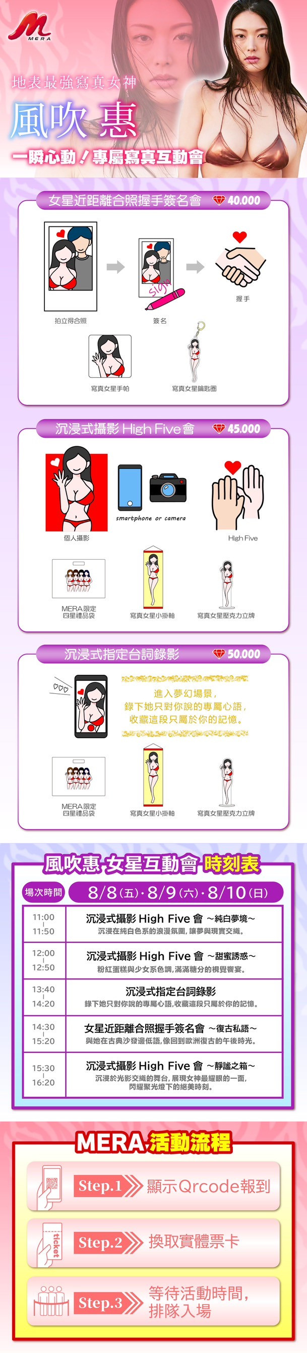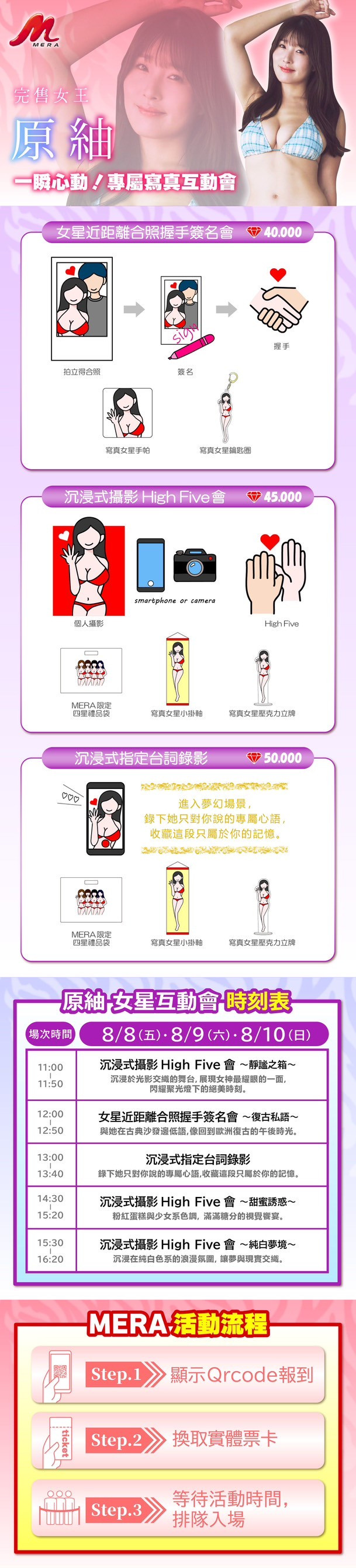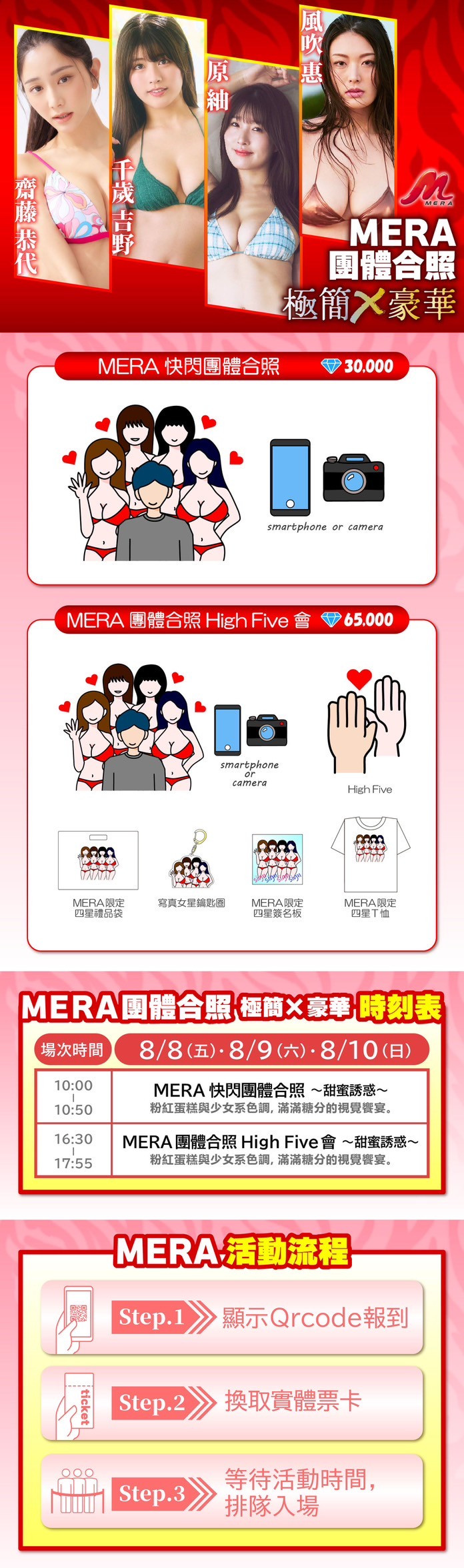 这阵容真的有点夸张,就算不追写真业界、你也应该在社群的推荐名单看过这些名字,在8月8日到10日她们就要活生生地出现在大家面前;而且MERA超有诚意的,除了高手如云外也有诚意满满的互动以及制作精美的商品,请大家参考图㸠说明,马上去JKFACE预约: