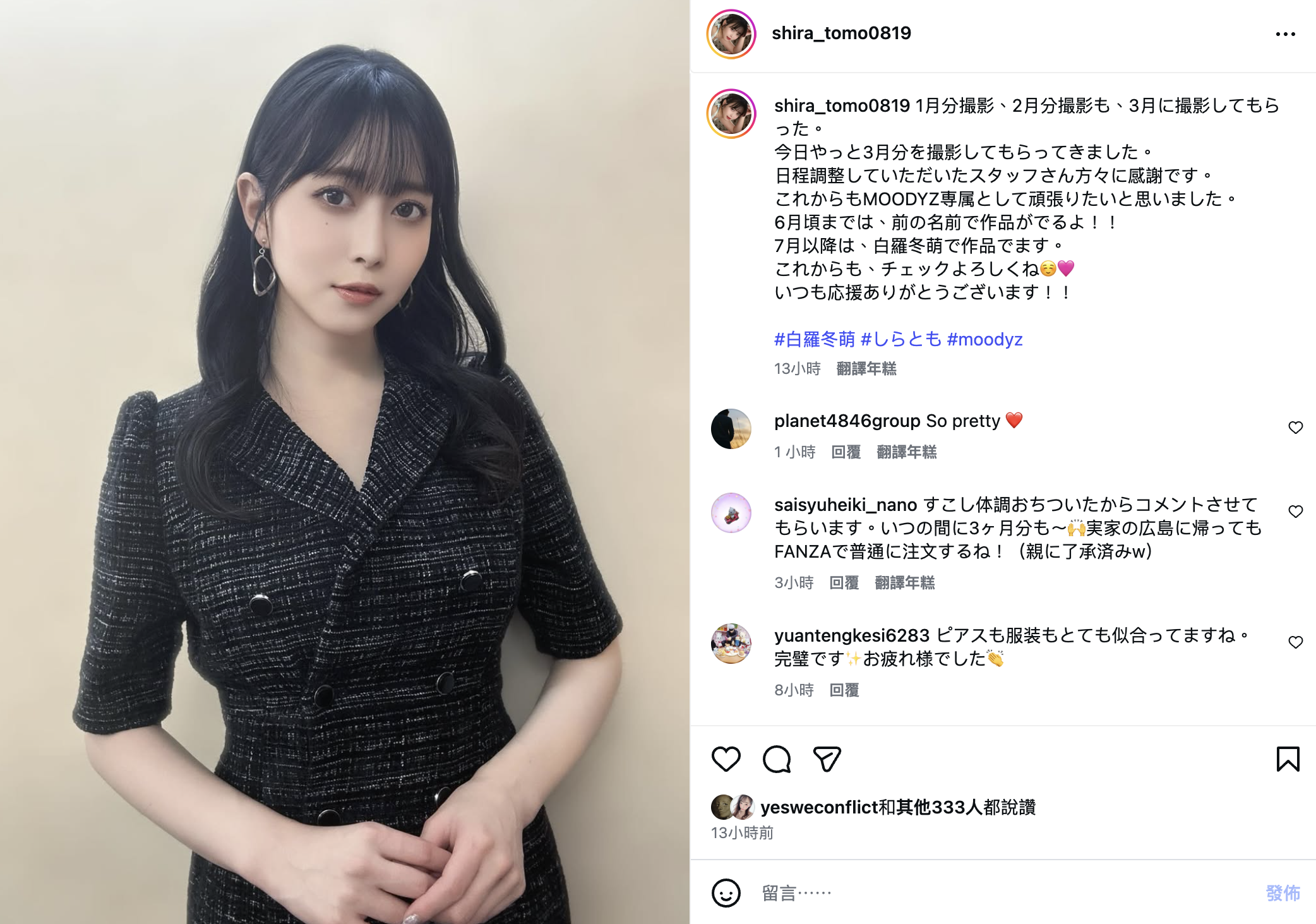 所以,必须夸奖一下白罗冬萌的新东家STARTUP,因为她更换经纪公司是突发状况,要和前事务所作交接、要帮她想一个大家都知道是她的新艺名还要处理拍片事宜,能做到无缝衔接真的蛮厉害的;也恭喜白罗冬萌,从发文来看她仍然会是Moodyz的专属女优,也就是说身分没变,片商仍然把她视为主力:
